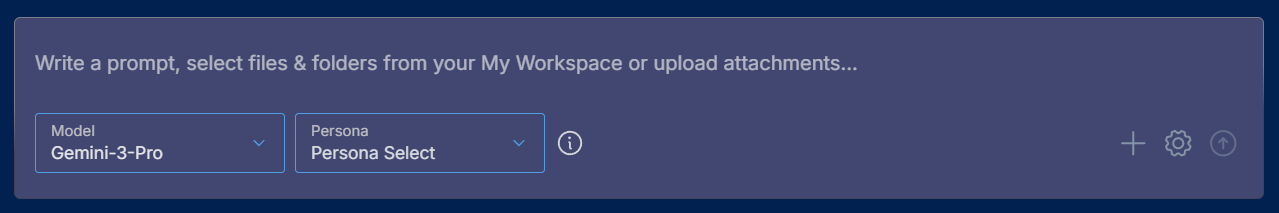 Bottom section where you type queries, select models and personas, adjust settings, and attach files.
