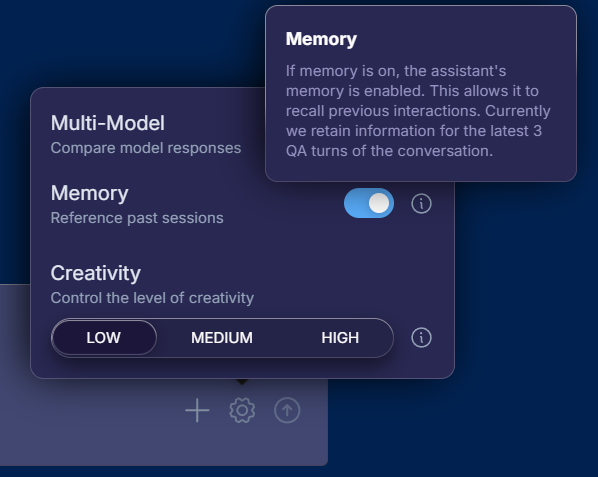 Click the settings gear icon to access chat configuration. Enable Memory to retain context across follow-ups. Adjust Creativity (Temperature): choose Low (0.0) for factual work, Medium (0.5) for balanced responses, or High (1.0) for creative brainstorming.