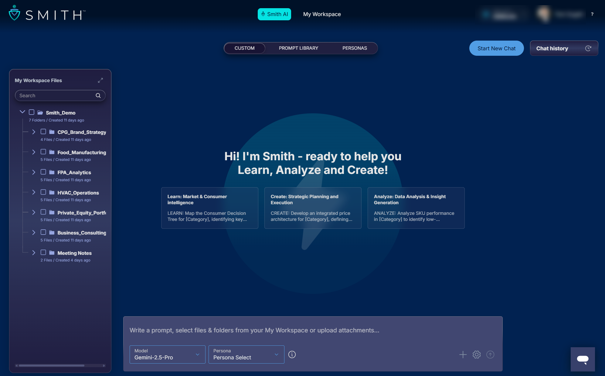Create personas with Name, Focus, and Prompt fields that define Smith's role, tone, and expertise. Save them as personal or shared resources across your team. Transform Smith into a financial analyst, legal researcher, operations strategist, or any specialized role your organization requires—ensuring consistent AI behavior across teams.