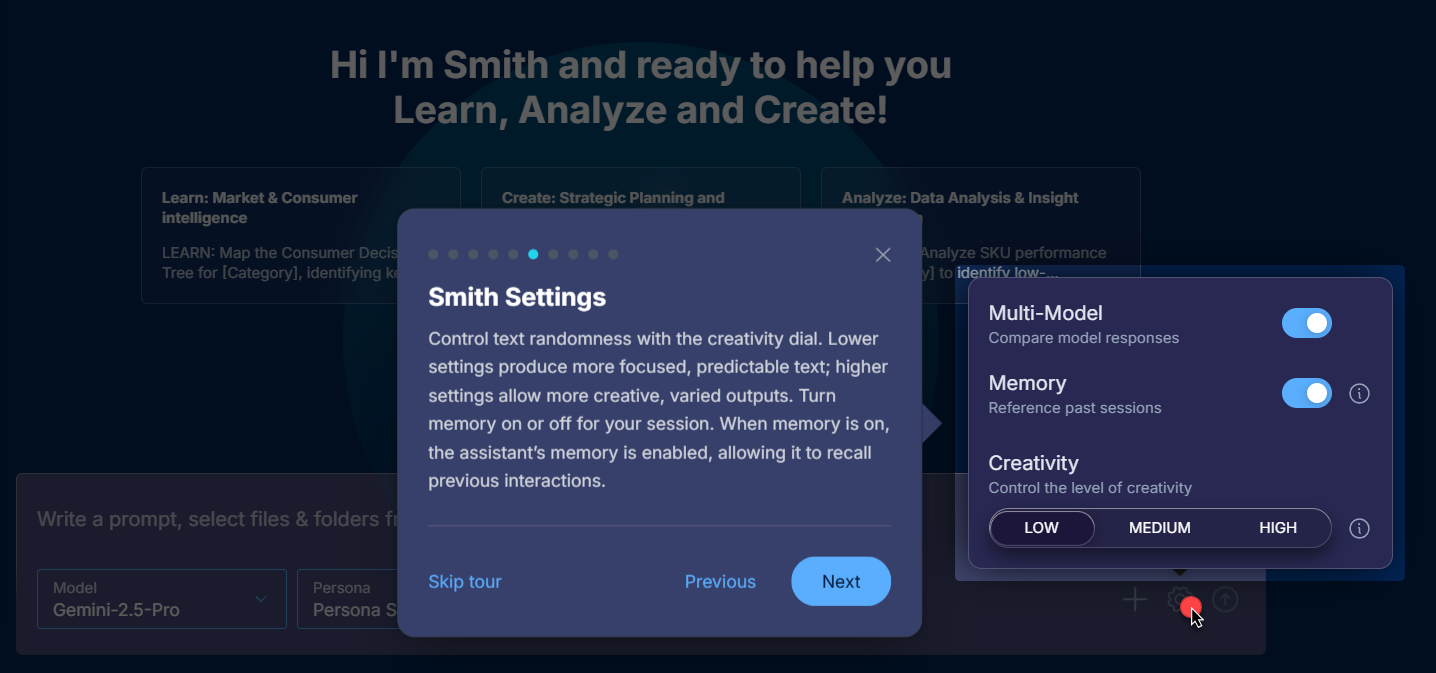 Quick Access Tip: Settings are context-aware and apply immediately to your current chat session. Changes you make will affect how Smith responds in ongoing and future conversations.