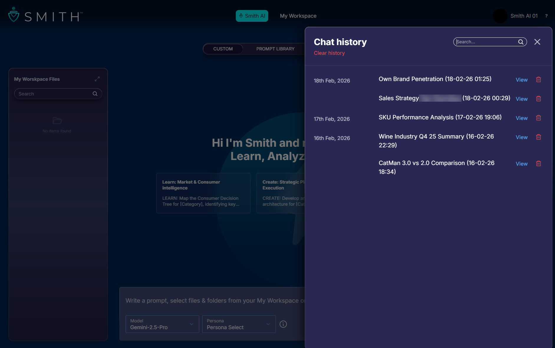Smith automatically saves your chat sessions so you can return to previous conversations, review past analyses, or continue where you left off. The Chat history button appears in the top-right corner of the interface.